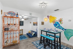 The kitchen is fully equipped with cookware, dishes, utensils, and essentials for preparing meals at home. The dining area showcases a hand-painted mermaid mural that gives the home its signature character.